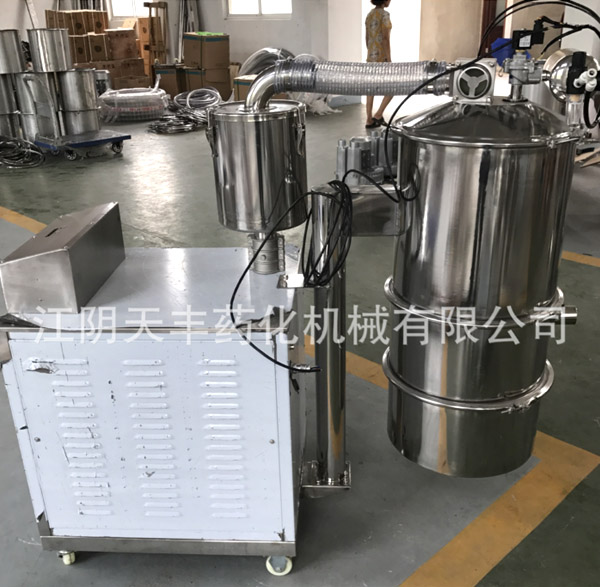 真空加料機由真空泵(無油、無水)、不銹鋼吸料咀、輸送軟管、PE過濾器,壓縮空氣反吸裝置、氣動放料門裝置、真空料斗和料位自動控制裝置等組成,整套系統(tǒng)設(shè)計合理、制造精美。